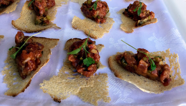 Lombo de vitela, cortado em cubinhos, chalota, cournichons, alcaparras, mostarda de Dijon, tabasco, pimenta moída, flor de sal, azeite, salsa picada (ou germinados de coentros) e uma gema de ovo no final. A mistura foi disposta sobre uma finíssima fatia de pão crocante.