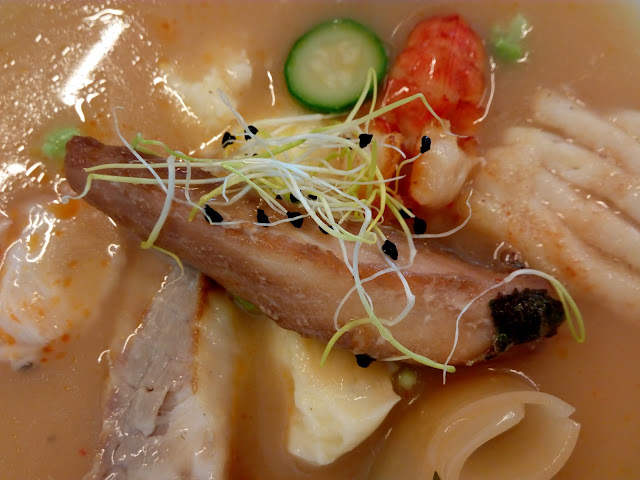 Uma variedade de peixes desde robalo, safio, raia e cação, até chegar ao sabor forte de camarão fumado. A acompanhar estava um rolinho de gelatina de caldo de peixe, romanesco, mini courgete, tudo isto sobre um puré de batata muito cremoso e envolvido num suave caldo de peixe e salpicado com rebentos de alho. Excelente!