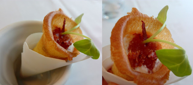 compota de cebola caramelizada, compota de tomate com bacon e rebentos de rábano. Entrada com elementos interessantes ao palato, em que o doce iniciou aqui timidamente a sua aparição.